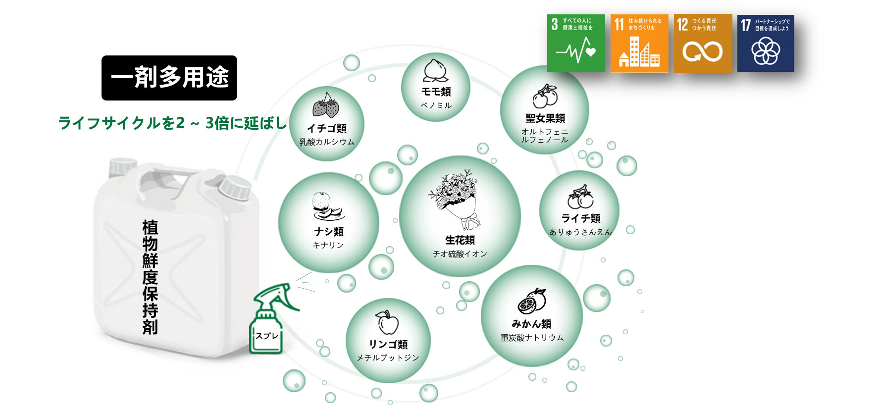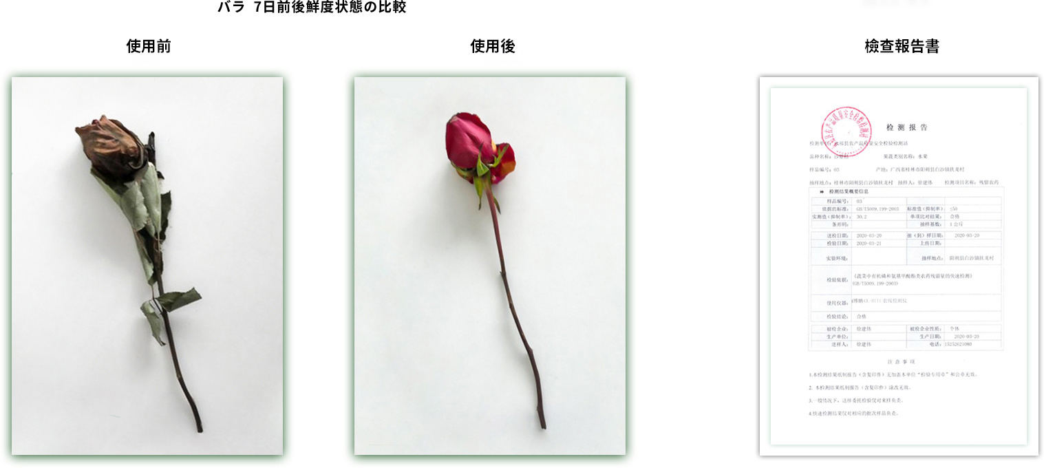 効率良く生鮮品の無駄廃棄を減らす。新しい技術を用い、包裝にスプレだけで、青果、野菜、生花などに直接觸れず、そのライフサイクルを2 ~ 3倍に延ばし、安全且つ衛生的である。