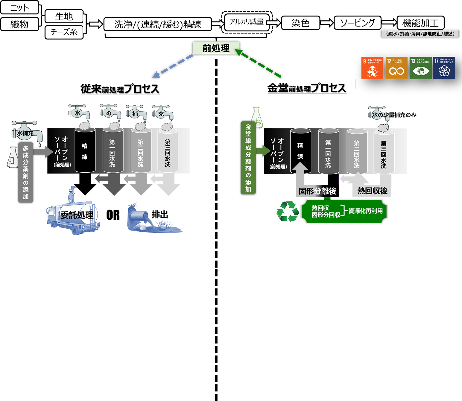 前処理廃水の循環再利用を実現(固形分?液體はすべて資源化再利用可能←固體を新しい材料とし、液體を生産に還流)