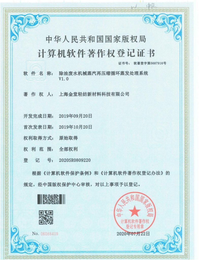 軟件名稱(chēng):除油廢水機(jī)械蒸汽再壓縮循環(huán)蒸發(fā)處理系統(tǒng)V1.0