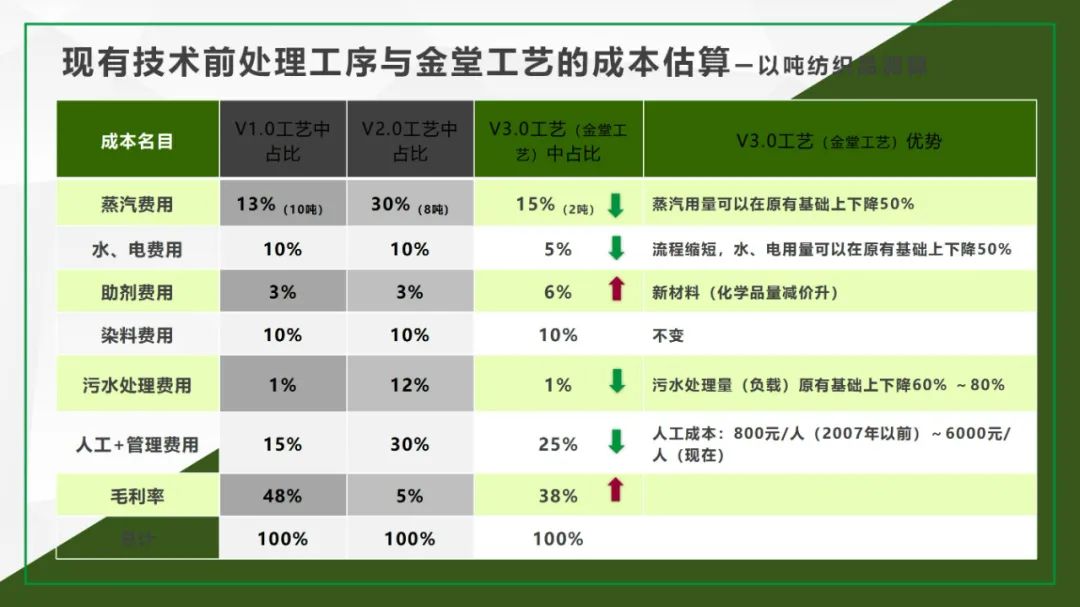 ? ? ? 現(xiàn)有技術(shù)前處理工序與金堂工藝的成本估算——以噸紡織品測(cè)算