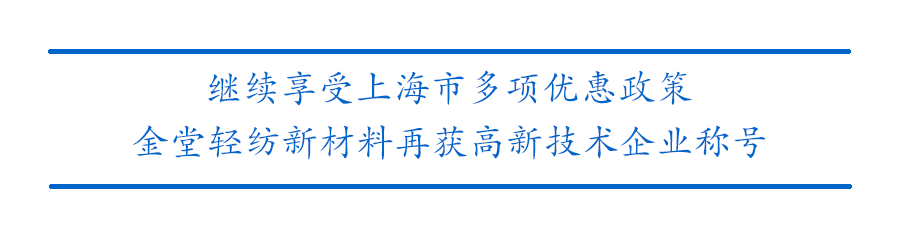 ? ? ? 近日,上海金堂輕紡新材料科技有限公司順利通過相關(guān)評審,繼2020年之后,再次獲得國家高新技術(shù)企業(yè)稱號。
